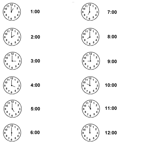 Math and Numbers - Time Clock - O'Clock The first clock below is read as 1 o'clock. The clock below that is read as 2 o'clock, etc. |